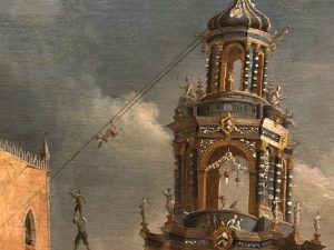 One of my favorite scenes in The Gallery of Beauties takes place on the opening night of Carnevale. Acrobats in human pyramids entertain the crowds in the main square of San Marco, and the most anticipated event is “The Flight of the Angel.”  Recently revived in today’s Carnevale celebrations, it is similar to the flight of Tinkerbell from Cinderella’s castle at Disneyworld.  A trained acrobat would start from the top of the tower of the Campanile of the church of San Marco, descending via zip line to land on the balcony of the Doge’s palace with a concluding somersault. In my story, all the notables of Venetian society await the acrobat’s descent, including the Doge, who will award a special medallion to the performer if he completes his feat successfully. Belladonna, a notorious courtesan is proud of having earned a place on the Doge’s balcony, legitimately able to rub shoulders among the elite of Venice.